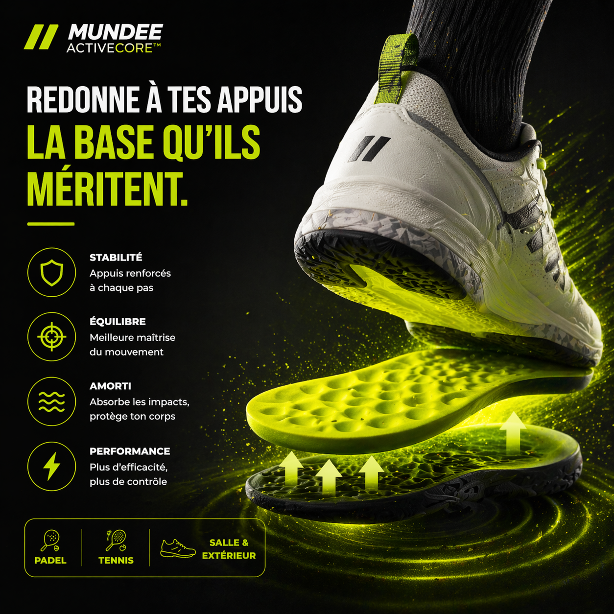 Avec Mundee ActiveCore™, profitez d’un meilleur maintien, d’une stabilité renforcée et d’un confort durable pour jouer plus longtemps, avec plus de précision et moins de fatigue.
